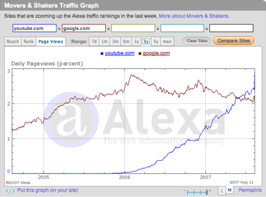 Una vez explicado que es y como funciona Alexa, en TechCrunch hacen referencia a una gráfica en la cual se puede apreciar como Youtube tiene más páginas vistas que Google según Alexa, un dato un poco irónico si me preguntan, sabiendo que Google tiene cerca de 100 billones de páginas vistas comparado con los 16 billones de Youtube.
